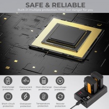 ЖК-дисплей с двойным зарядным устройством точно отображает состояние зарядки аккумулятора, а в процессе зарядки используется смарт-чип для лучшей защиты аккумулятора; порт зарядки с двумя слотами позволяет быстро заряжать две батареи одновременно, что значительно экономит ваше время и является лучшим выбором для путешествий в дороге.
