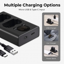 Двухслотовое быстрое зарядное устройство с входами Micro USB и Type-C, позволяет заряжать аккумулятор через сетевое зарядное устройство USB, автомобильное зарядное устройство или внешний источник питания. Примечание: для быстрой зарядки рекомендуется использовать адаптер питания с выходом 5 В 2,1 А.